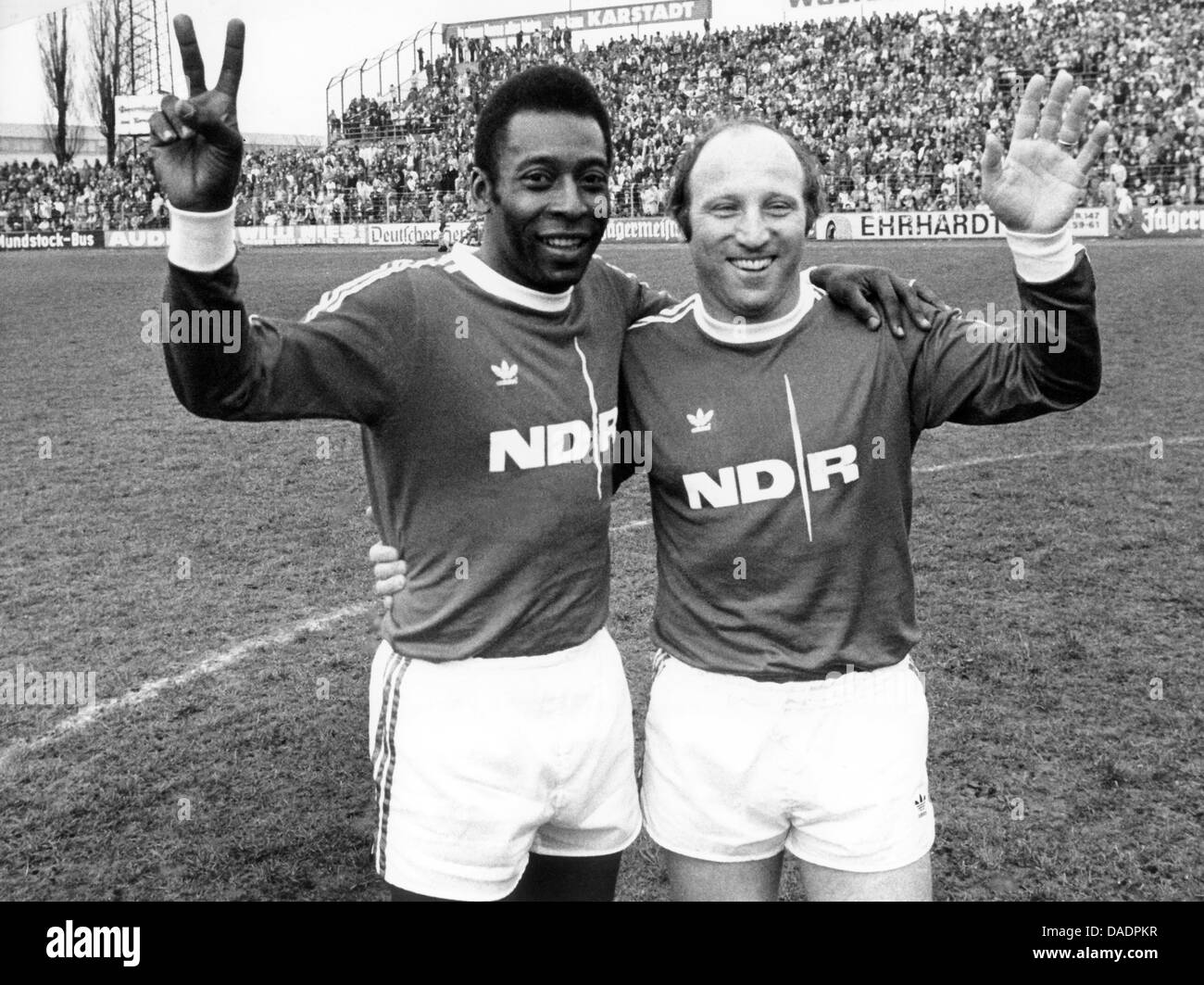 Dpa File Un File Immagine Datata 21 Aprile 1975 Mostra La Germania Onorario Di Capitano Di Una Squadra Uwe Seeler R E Il Brasile E Leggenda Del Calcio Pele Abbracciando E